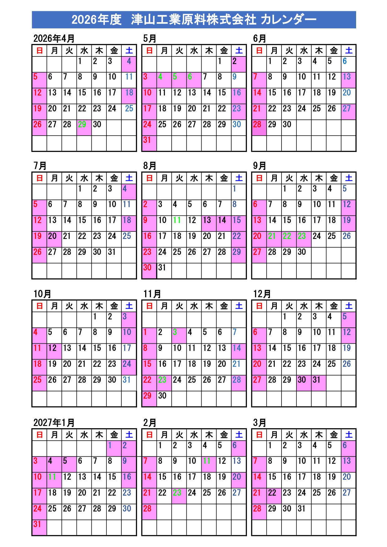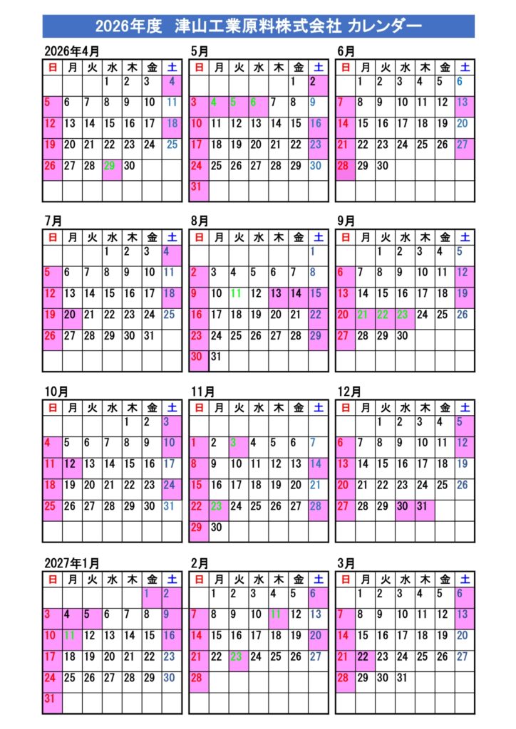 2026年度のカレンダーが出来上がりましたので下記の通りお知らせいたします。